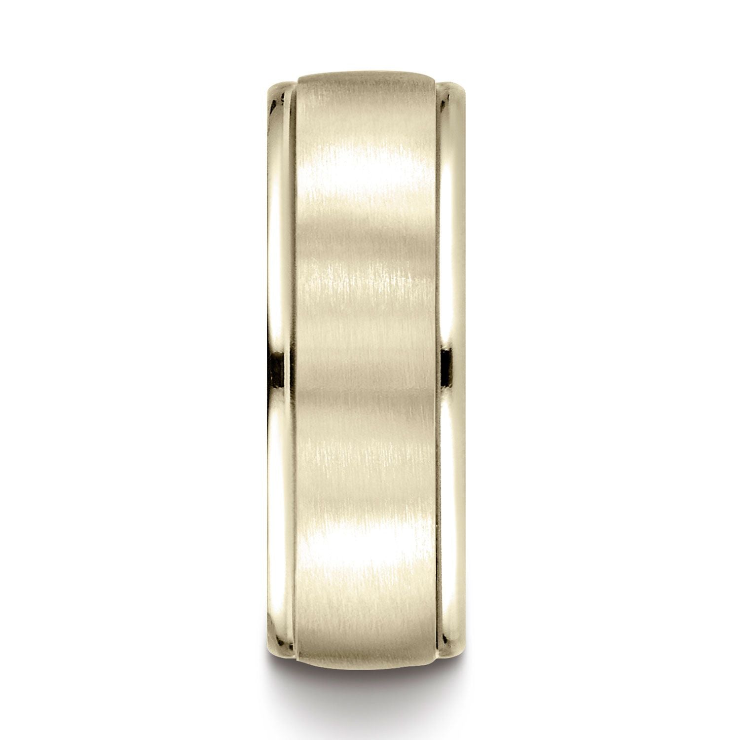 แหวนวงนี้ทำจากทองคำ 14 กะรัต สีเหลือง ขนาด 8 มม. ดีไซน์สลักลายแบบสวมใส่สบาย มีผิวด้านพร้อมขอบกลมขัดเงาสูงเพื่อสไตล์ที่โดดเด่น