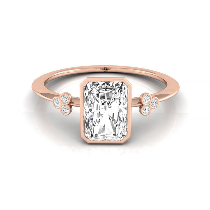 แหวนหมั้นแบบเรเดียนท์ฝังเม็ดเพชรทรงกลม 6 เม็ดบนก้านแหวน ฝังเม็ดเพชรแบบเบเซิล 14 กะรัต