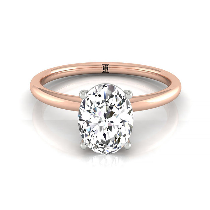 แหวนหมั้นโซลิแทร์รูปวงรี 14 กะรัต พร้อมฮาโลลับด้านล่างโค้งและเพชรรูปกลม 8 กรง