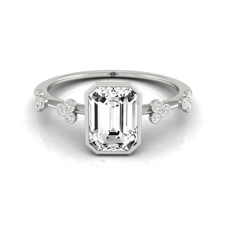 แหวนหมั้นมรกตแบบขอบ 14kw พร้อมเพชรรูปใบโคลเวอร์แบบขอบ 12 เม็ดบนวงแหวน