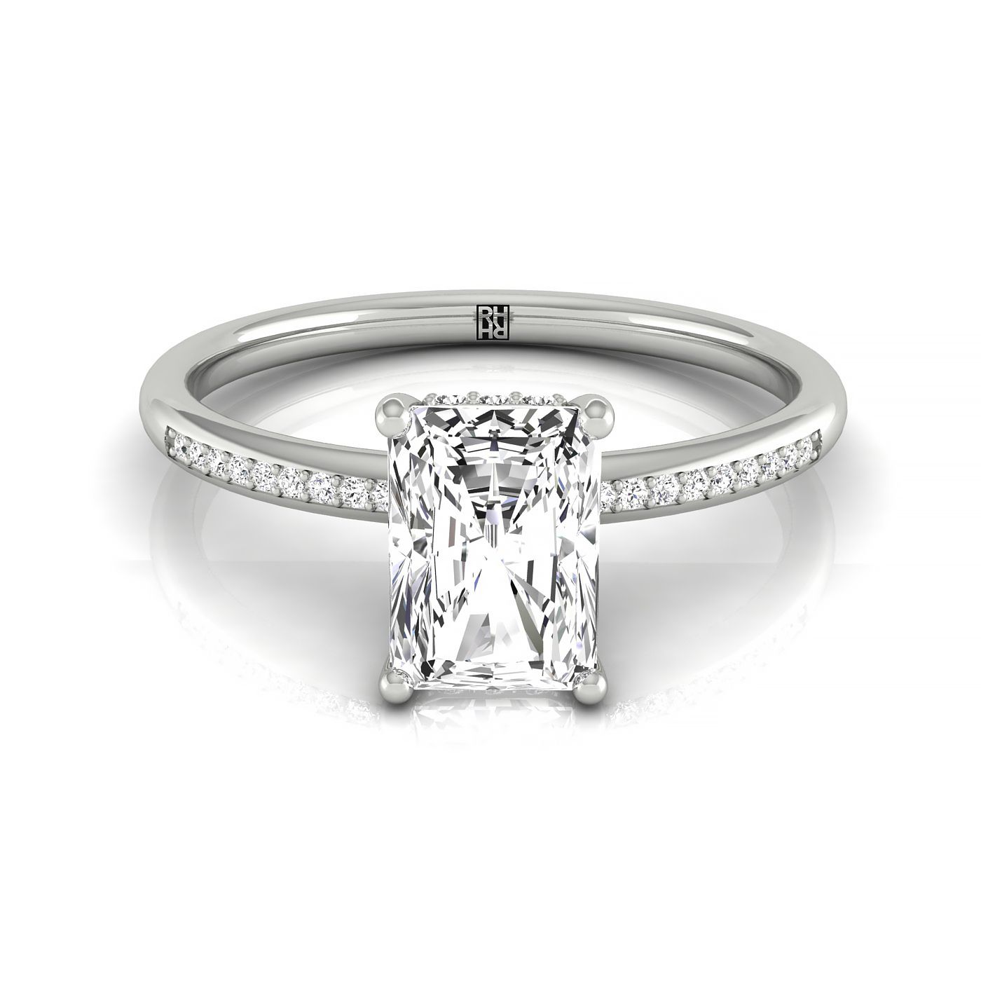แหวนหมั้นเรเดียนท์ 14kw พร้อมฮาโลซ่อนสูงและเพชรรูปกลม 42 เม็ดแบบตั้งด้วยกรง