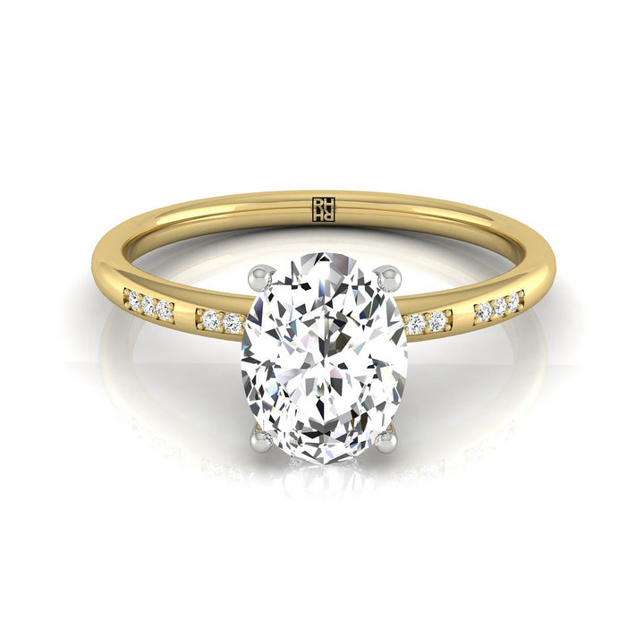 แหวนหมั้นรูปไข่ 14ky พร้อมฮาโลซ่อนสูงและเพชรรูปกลม 26 เม็ดแบบตั้งด้วยกรง