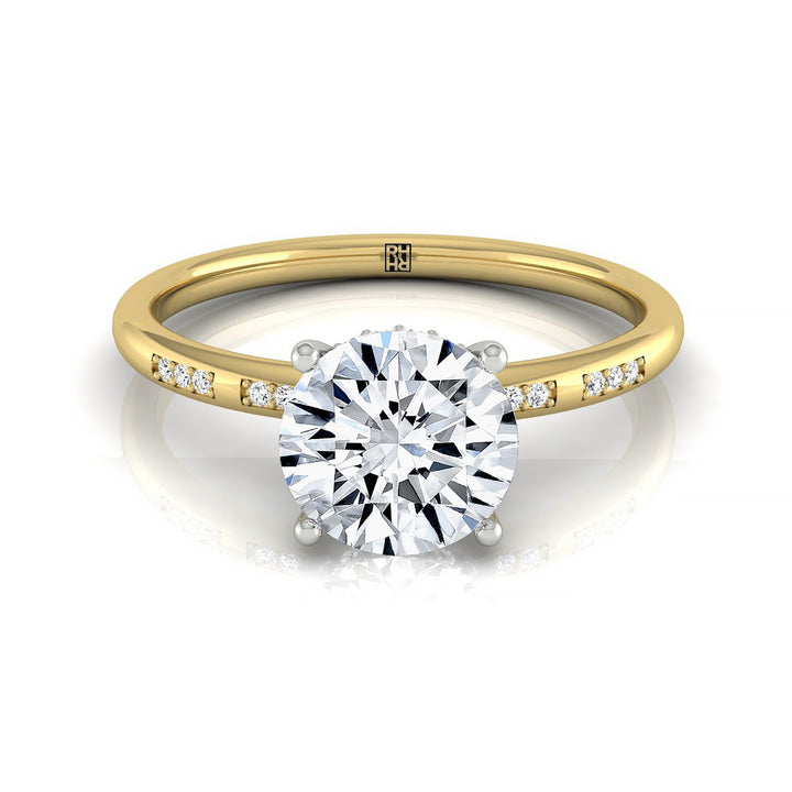 แหวนหมั้นทรงกลม 14ky พร้อมฮาโลซ่อนสูงและเพชรรูปกลม 26 เม็ดแบบตั้งด้วยกรง