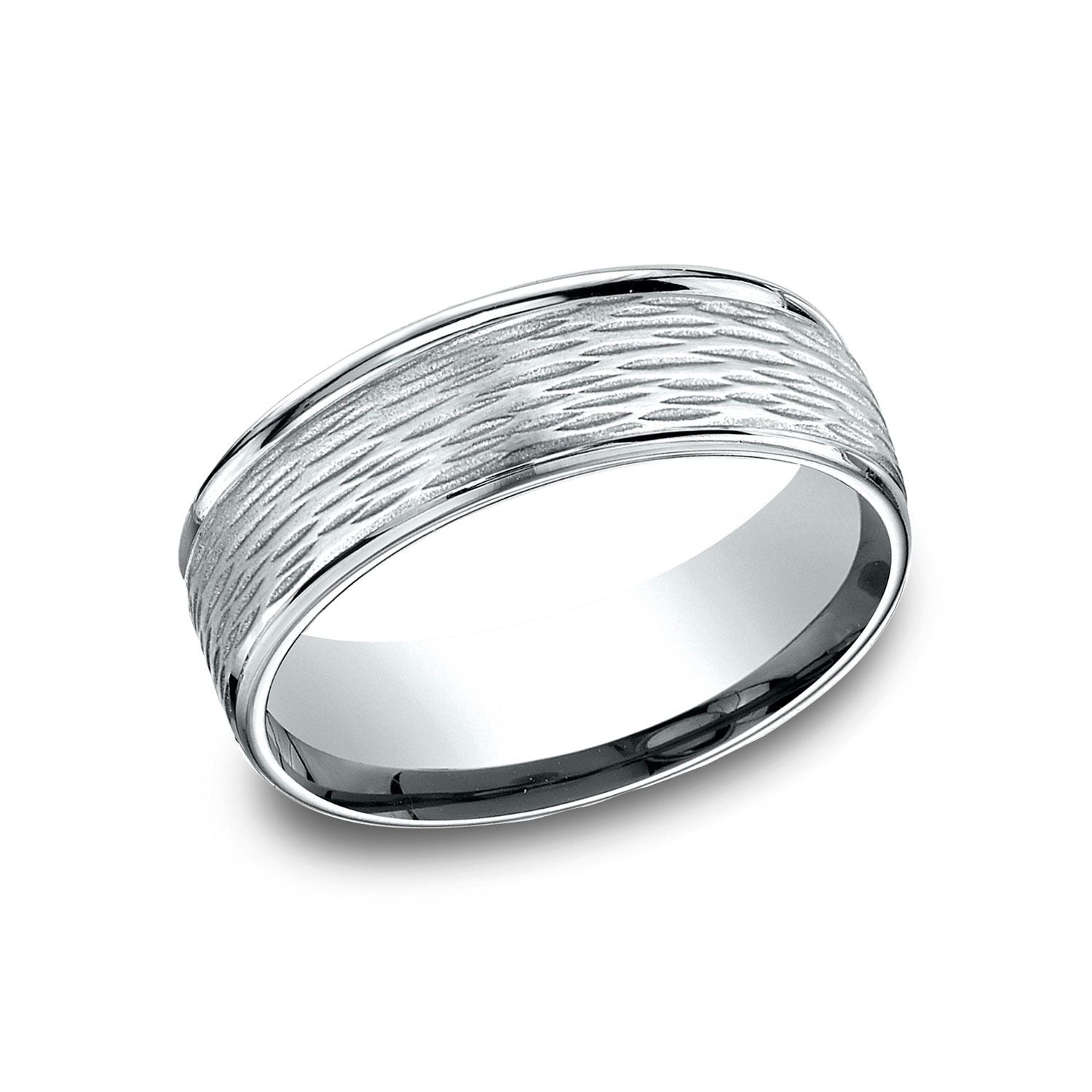 ทองคำขาว 18 กะรัต ขอบกลมสวมใส่สบาย 7.5 มม. ตรงกลางลายเปลือกไม้เบิร์ช