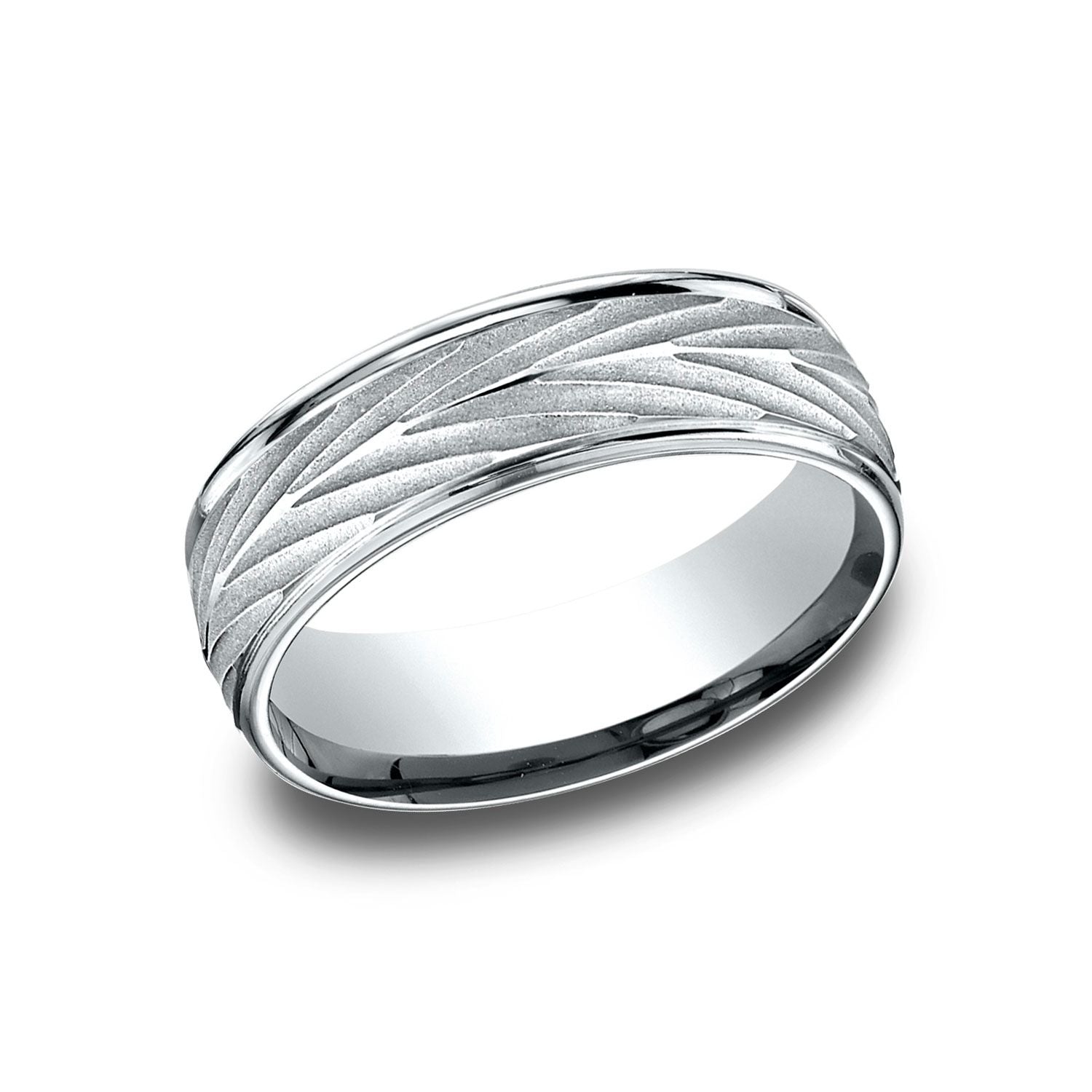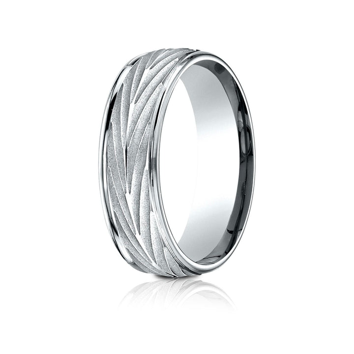 การตีความที่ประดับประดาของแถบคลาสสิกนี้ แหวนดีไซน์ทองคำขาว 18 กะรัต ขนาด 7 มม. ที่สวมใส่สบายนี้ มีขอบกลมขัดเงาสูงที่ล้อมรอบลวดลายลูกศรที่สอดคล้องกัน