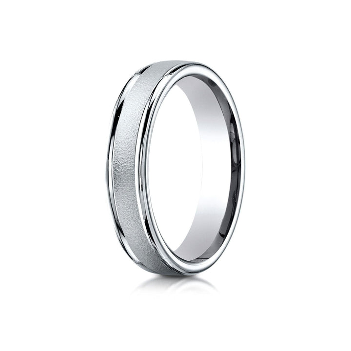 แหวนดีไซน์แกะสลักขนาด 4 มม. สีขาว 18 กะรัต แบบสวมใส่สบาย มีขอบกลมขัดเงาสูงและพื้นผิวแบบลวดลายสำหรับสไตล์ที่โดดเด่น
