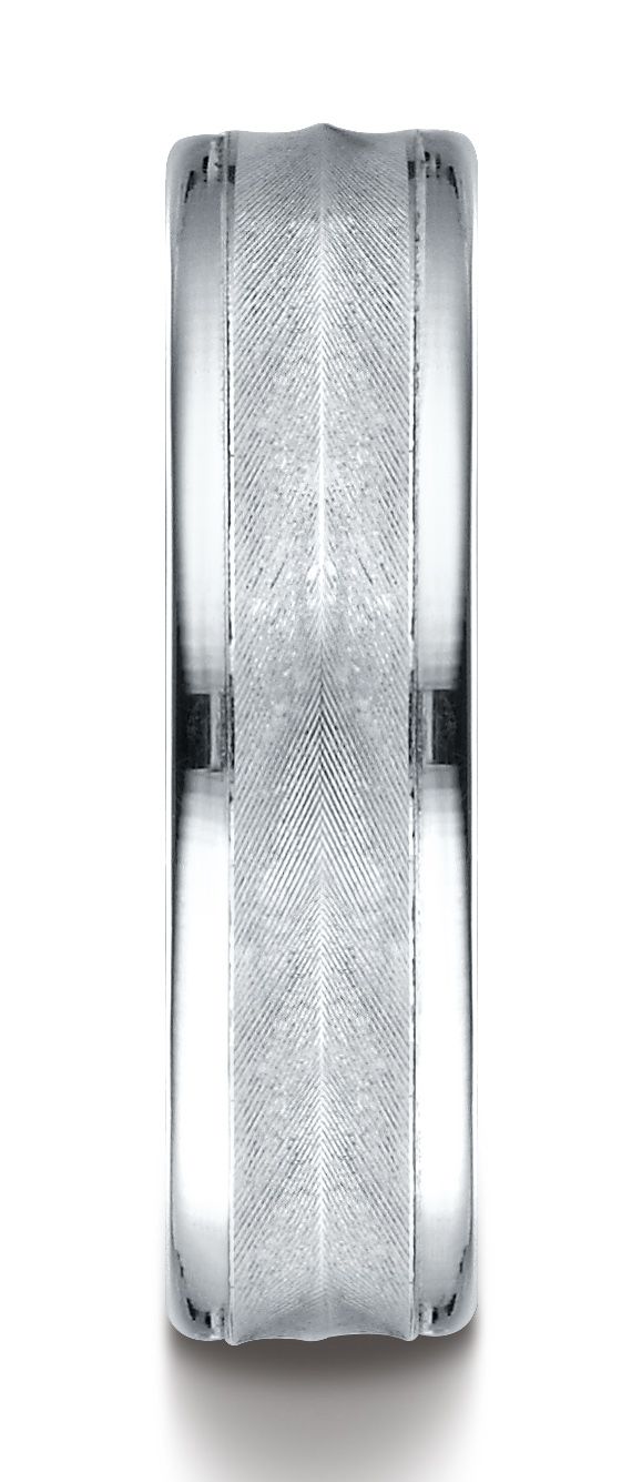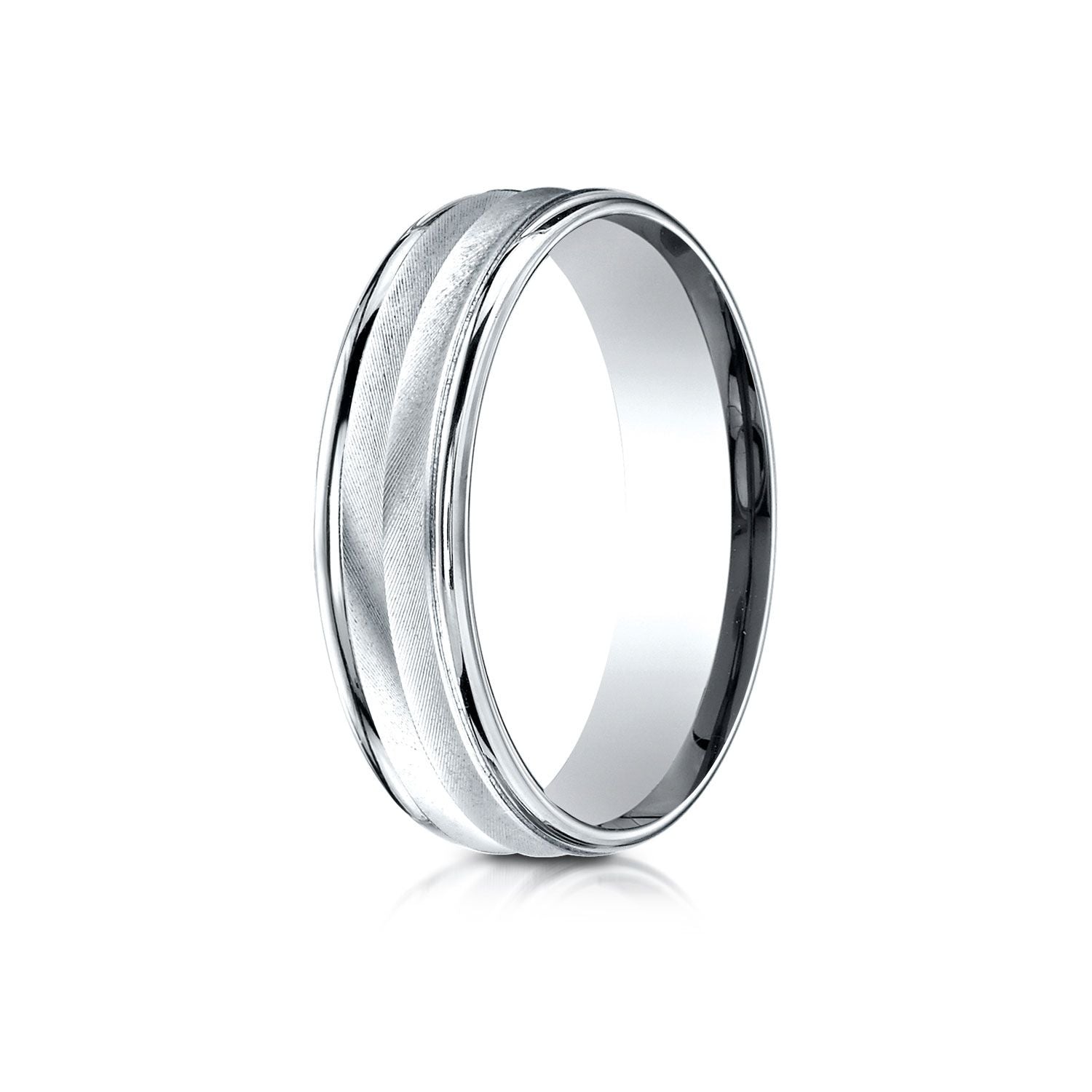 แหวนดีไซน์แกะสลักขนาด 6 มม. สีขาว 18 กะรัต แบบสวมใส่สบาย มีลวดลายเชฟรอนที่ซับซ้อน พร้อมขอบกลมขัดเงาสูง ให้ลุคที่ทันสมัยและหรูหรา