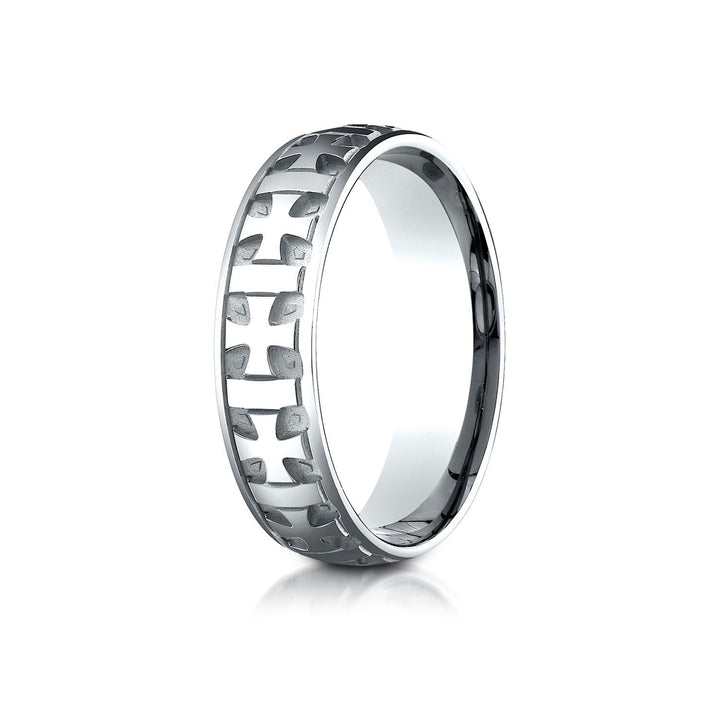 แหวนวงนี้ทำจากทองคำขาว 18 กะรัตที่น่าทึ่ง ขนาด 6 มม. แบบสวมใส่สบาย พร้อมลวดลายแกะสลักที่โดดเด่น มีการสลักกากบาทเกลิคที่ขัดเงาสูงตลอดแนวกลางของแหวน ซึ่งแสดงถึงสไตล์ที่น่าประทับใจอย่างยิ่ง