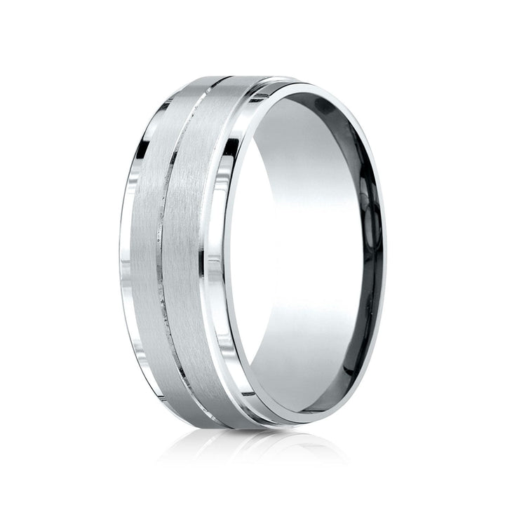 แหวนดีไซน์สวมใส่สบายขนาด 8 มม. ทำจากทองคำขาว 18 กะรัต มีขอบเอียงขัดเงาสูงที่แสดงให้เห็นถึงผิวด้านตรงกลาง
