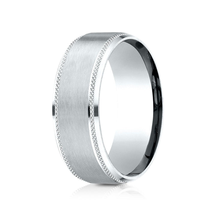 สวยงามทันสมัย แหวนดีไซน์สวมใส่สบายขนาด 8 มม. ทำจากทองคำขาว 18 กะรัตนี้มีขอบหยักเฉพาะตัว มุมเอียง และผิวด้านตรงกลาง