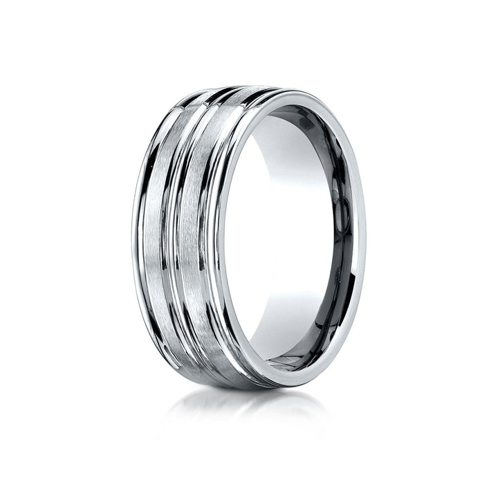 แหวนดีไซน์แกะสลักแบบสวมใส่สบายขนาด 8 มม. สีขาว 18 กะรัตนี้มีขอบกลมขัดเงาสูงและขอบกลางที่ให้ความสม่ำเสมออย่างละเอียดอ่อนในสไตล์และรูปทรง