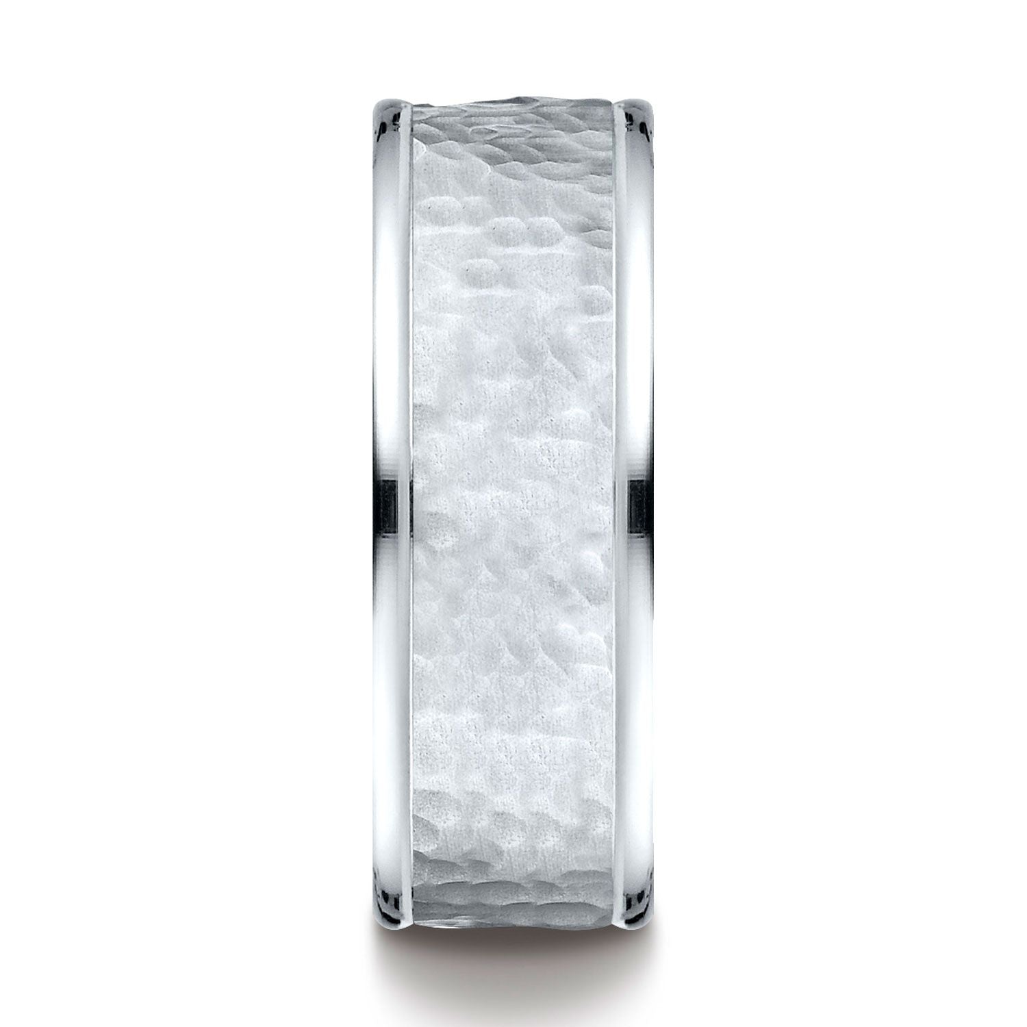 แหวนวงนี้ทำจากทองคำขาว 18 กะรัตที่ซับซ้อนอย่างสูง ขนาด 8 มม. แบบสวมใส่สบาย มีขอบขัดเงาสูงและตรงกลางที่มีลวดลายตีด้วยค้อน