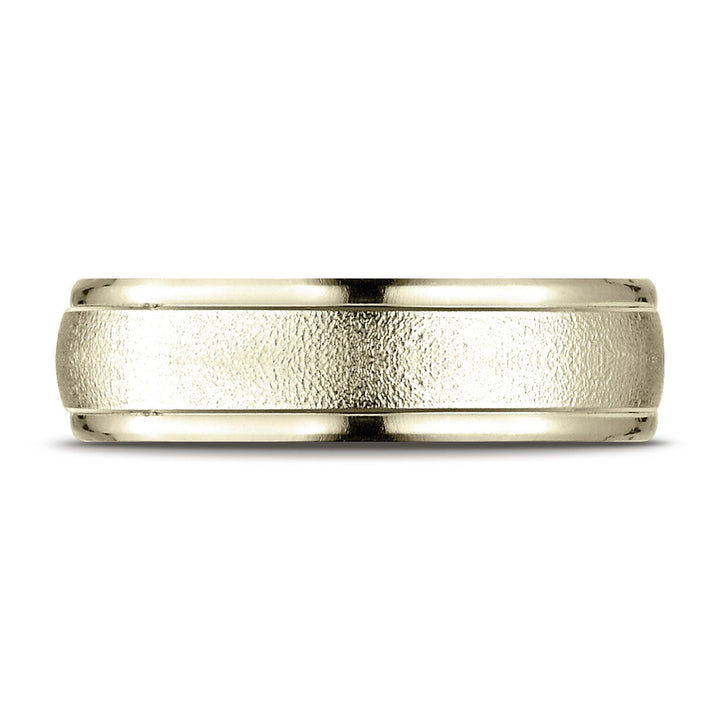 แหวนดีไซน์แกะสลักแบบสวมใส่สบายกว้าง 6 มม. ทำจากทองคำ 18 กะรัตสีเหลืองนี้ มีขอบกลมขัดเงาสูงพร้อมการตกแต่งแบบลวดลายสายไฟเพื่อสไตล์ที่โดดเด่น