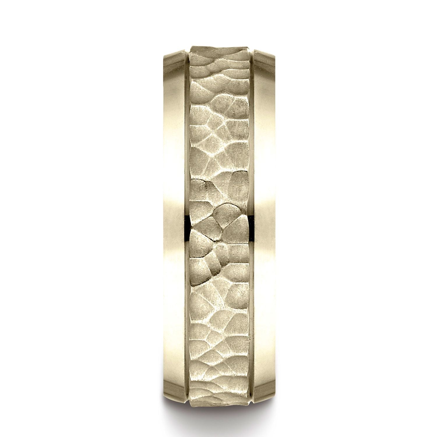 แถบสีเหลือง 18 กะรัต ขนาด 7.5 มม. นี้มีขอบเอียงและพื้นผิวแบบตีด้วยค้อนเพื่อรูปลักษณ์ที่ทันสมัยอย่างเป็นเอกลักษณ์