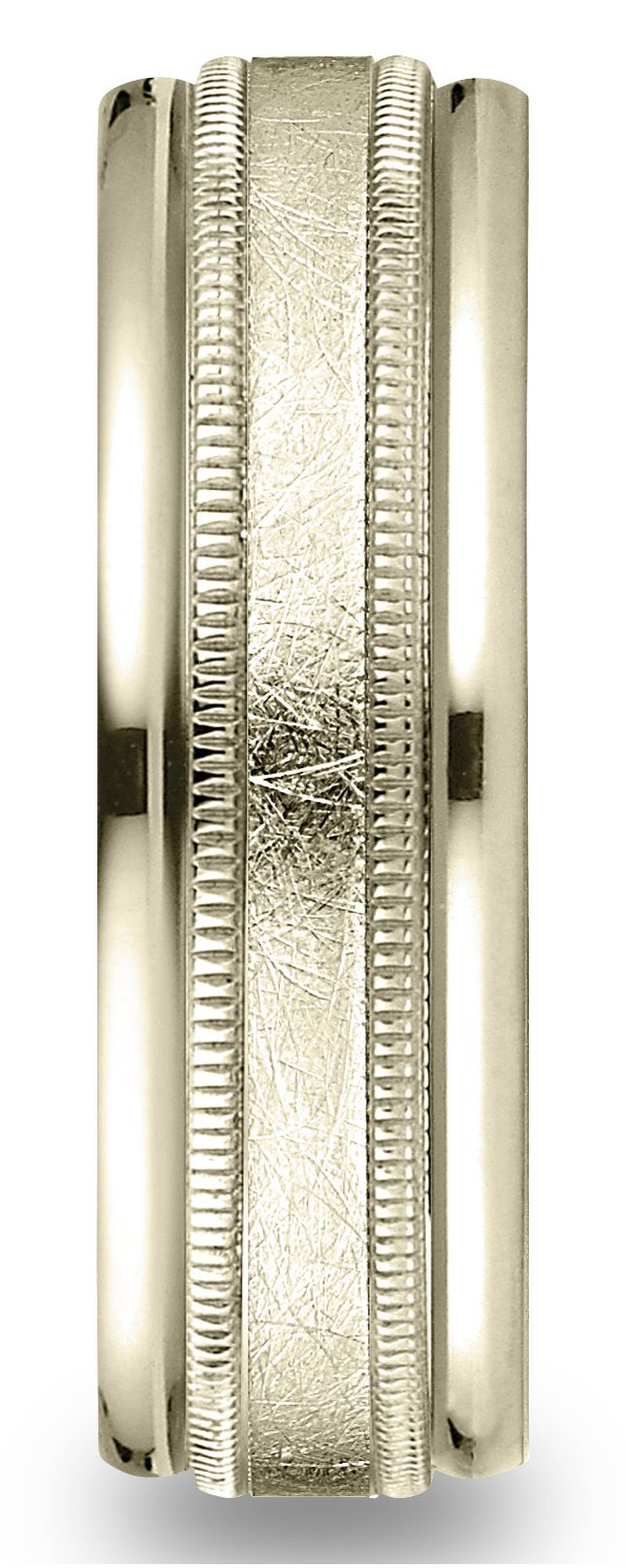 แหวนดีไซน์แกะสลักขนาด 10 กะรัต สีขาว ขนาด 7 มม. ที่มีความสบายในการสวมใส่ มีขอบมนที่ขัดเงาและพื้นผิวที่มีลักษณะเป็นเกลียว ซึ่งถูกจัดกรอบด้วยรายละเอียดแบบมิลเกรน