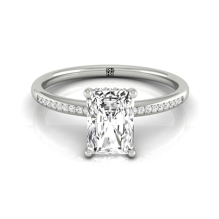 แหวนหมั้นเรเดียนท์ 18kw พร้อมฮาโลซ่อนสูงและเพชรรูปกลม 42 เม็ดแบบตั้งด้วยกรง