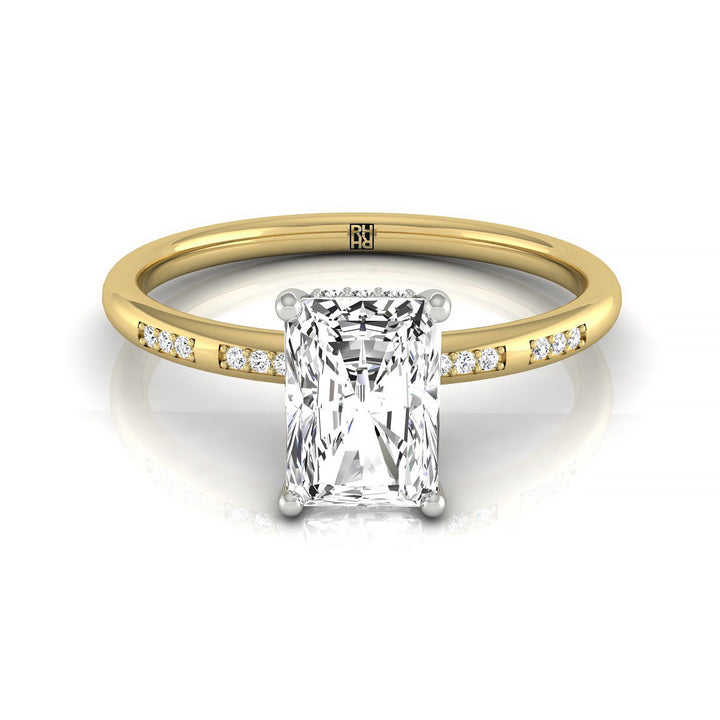 แหวนหมั้นเรเดียนท์ 18ky พร้อมฮาโลซ่อนสูงและเพชรรูปกลม 36 เม็ดแบบตั้งกรง