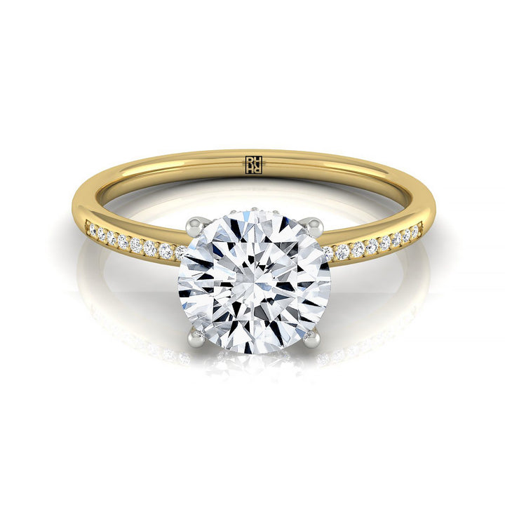 แหวนหมั้นทรงกลม 18 กะรัต พร้อมฮาโลซ่อนสูงและเพชรรูปกลม 32 เม็ดแบบตั้งด้วยกรง