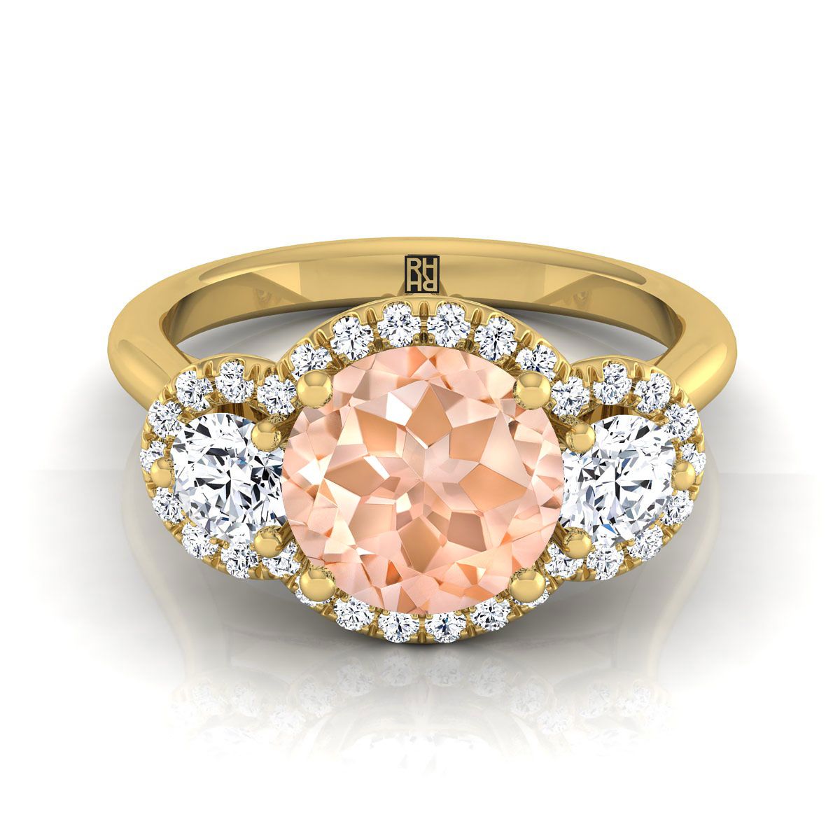 แหวนหมั้นสามก้อนเพชรฝรั่งเศสประดับมอร์แกไนต์ทรงกลมเจียระไนแบบบริลเลียนต์ 18K ทองเหลืองน้ำหนักรวม 1/2 กะรัต