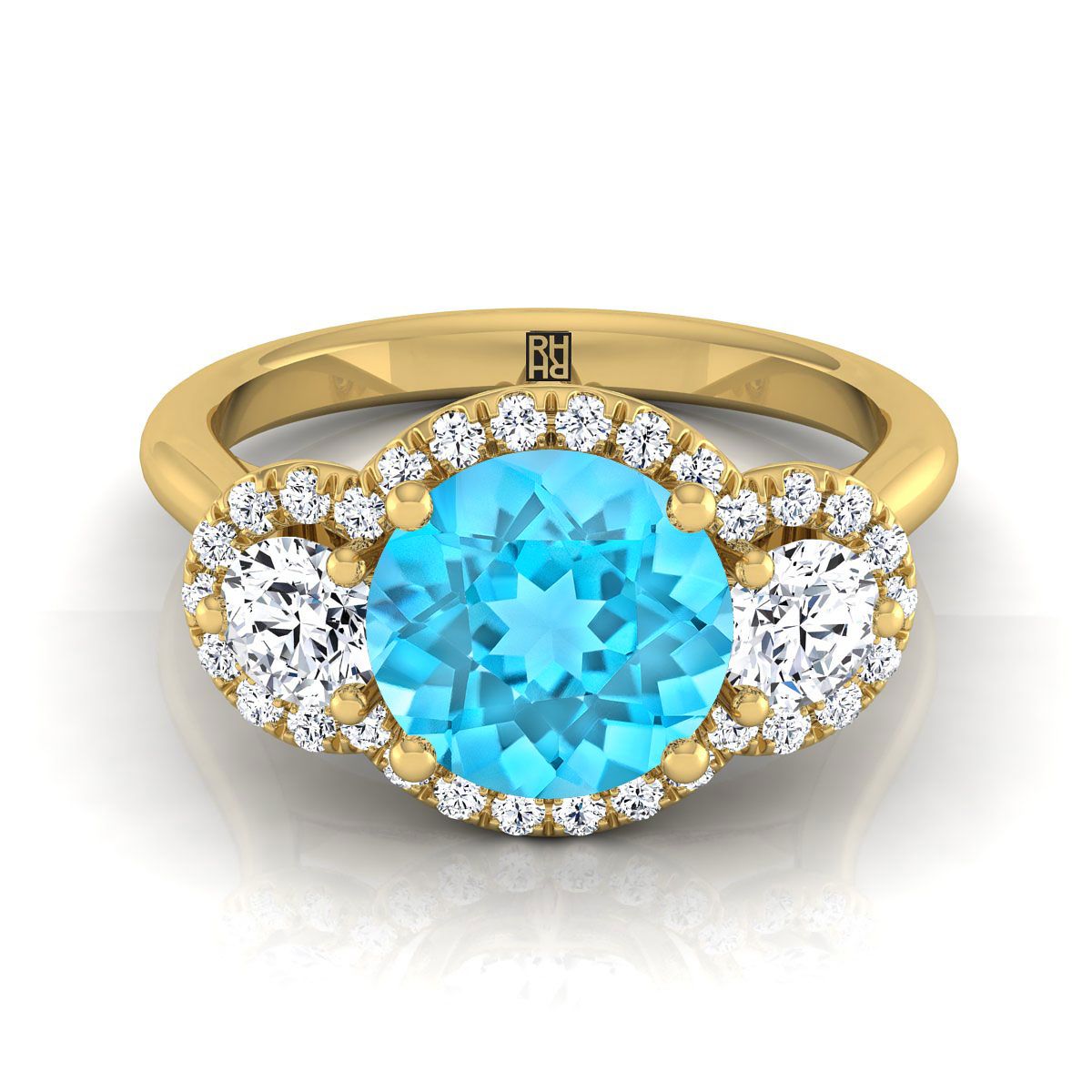 แหวนหมั้นสามก้อนประดับเพชรฝรั่งเศสแบบปาเว่ ทองคำเหลือง 14K ประดับทับทิมสวิสสีน้ำเงินทรงกลมเจียระไนแบบบริลเลียนต์ - 1/2 กะรัตรวม
