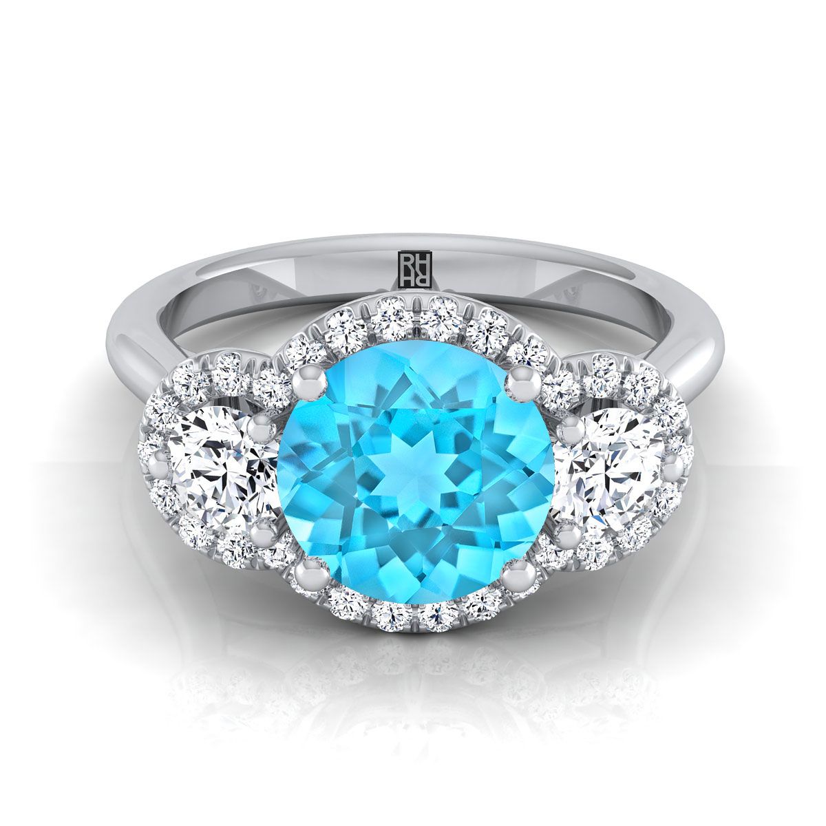 แหวนหมั้นสามก้อนเพชรฝรั่งเศสประดับทับทิมสวิสสีน้ำเงินทรงกลมเจียระไนแบบบริลเลียนท์ทองคำขาว 18K - 1/2ctw