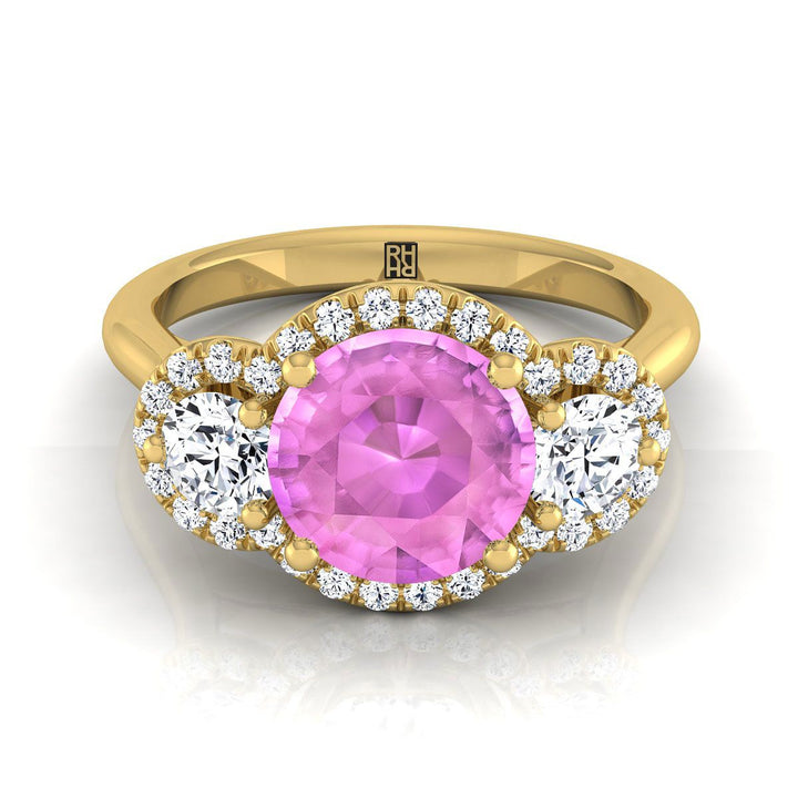 แหวนหมั้นสามก้อนประดับไพลินสีชมพูทรงกลมเจียระไนแบบบริลเลียนต์ทองคำเหลือง 14K ฝรั่งเศสประดับเพชรแบบปาเว - 1/2ctw