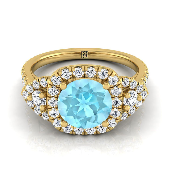 แหวนหมั้นเพชรประดับสามเม็ดแบบฮาโล่ประณีต ประกอบด้วยอความารีนทรงกลมเจียระไนแบบบริลเลียนต์ 14K ทองเหลืองน้ำหนักรวม 5/8 กะรัต