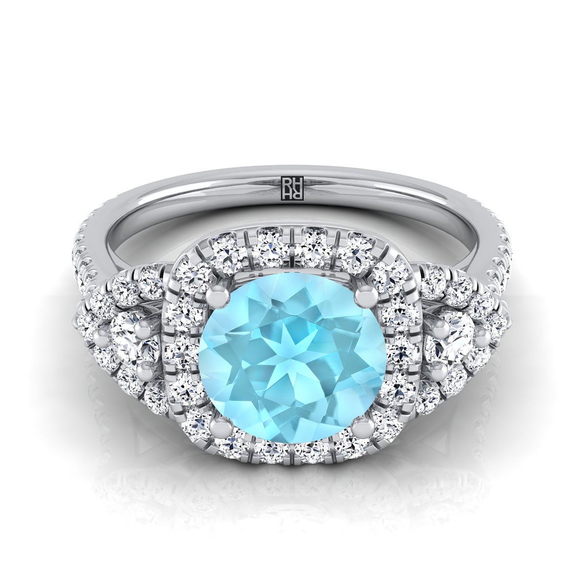 แหวนหมั้นเพชรประดับสามเม็ดแบบฮาโล่ประณีต พลาตินัม ทรงกลมเจียระไนแบบบริลเลียนท์ อะความารีน -5/8ctw