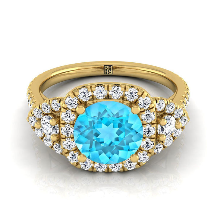 แหวนหมั้นเพชรสามเม็ดแบบฮาโล่ประดับเพชรปาเว่และทับทิมสวิสสีน้ำเงินทรงกลมเจียระไนแบบบริลเลียนต์สีเหลืองทอง 14K - 5/8 กะรัตรวม
