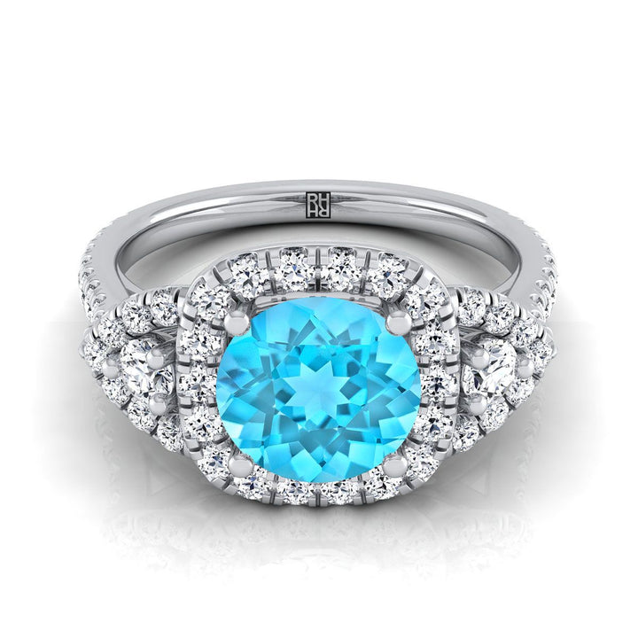 แหวนหมั้นเพชรสามเม็ดแบบฮาโล่ประดับเพชรปาเว่และทับทิมสวิสสีน้ำเงินทรงกลมเจียระไนแบบบริลเลียนท์ทองคำขาว 18K - 5/8 กะรัตรวม