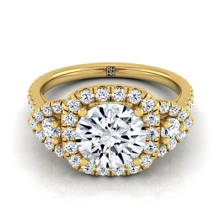 แหวนหมั้นประดับเพชรทรงกลมเจียระไนแบบ Brilliant สีเหลืองทอง 18K ดีไซน์สามเม็ดพร้อมฮาโลและเพฟ - 5/8 กะรัตรวม