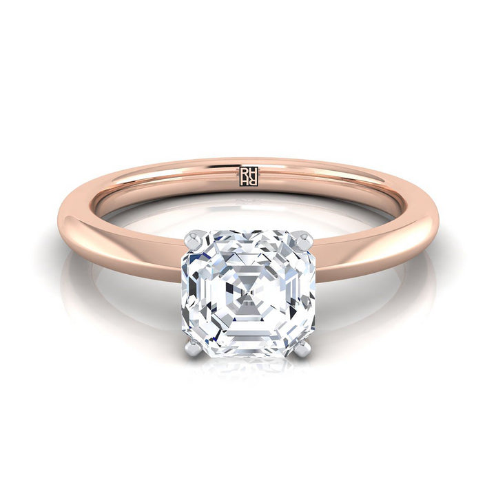 แถลงการณ์คลาสสิกของสไตล์ แหวนหมั้นแบบโซลิแทร์ที่ตัดแบบแอสเชอร์นี้มีการออกแบบที่ทันสมัยด้วยขอบมีดและการตั้งศูนย์แบบ 4 ขาในทองคำกุหลาบ 14k