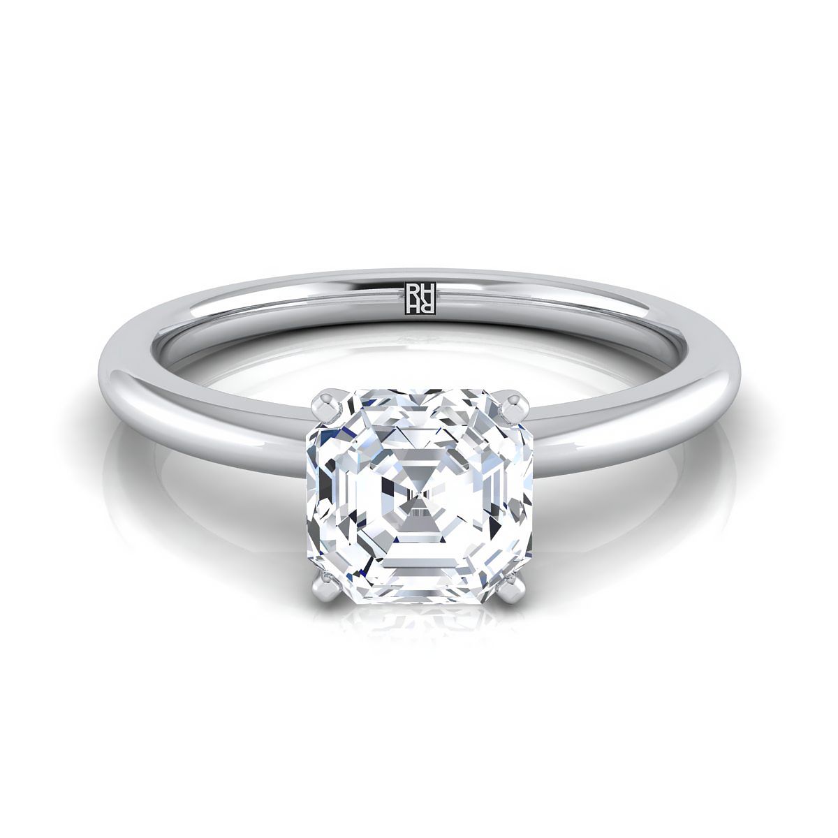 แหวนหมั้นแบบโซลิแทร์ทรงแอสเชอร์สุดคลาสสิกนี้แสดงให้เห็นถึงสไตล์ที่โดดเด่น พร้อมด้วยแหวนวงโค้งมนและการตั้งเม็ดกลางแบบ 4 ก้านในแพลตตินัม