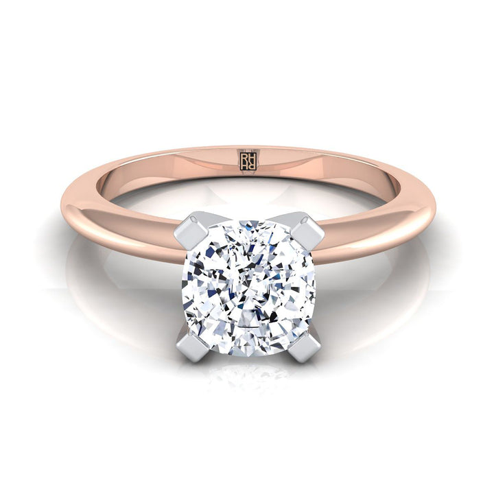 แถลงการณ์คลาสสิกของสไตล์ แหวนหมั้นแบบโซลิแทร์ที่มีการตัดแบบคุชชั่นนี้นำเสนอแชงค์ขอบมีดที่ทันสมัยและการตั้งศูนย์แบบ 4 ขาในทองคำกุหลาบ 14k