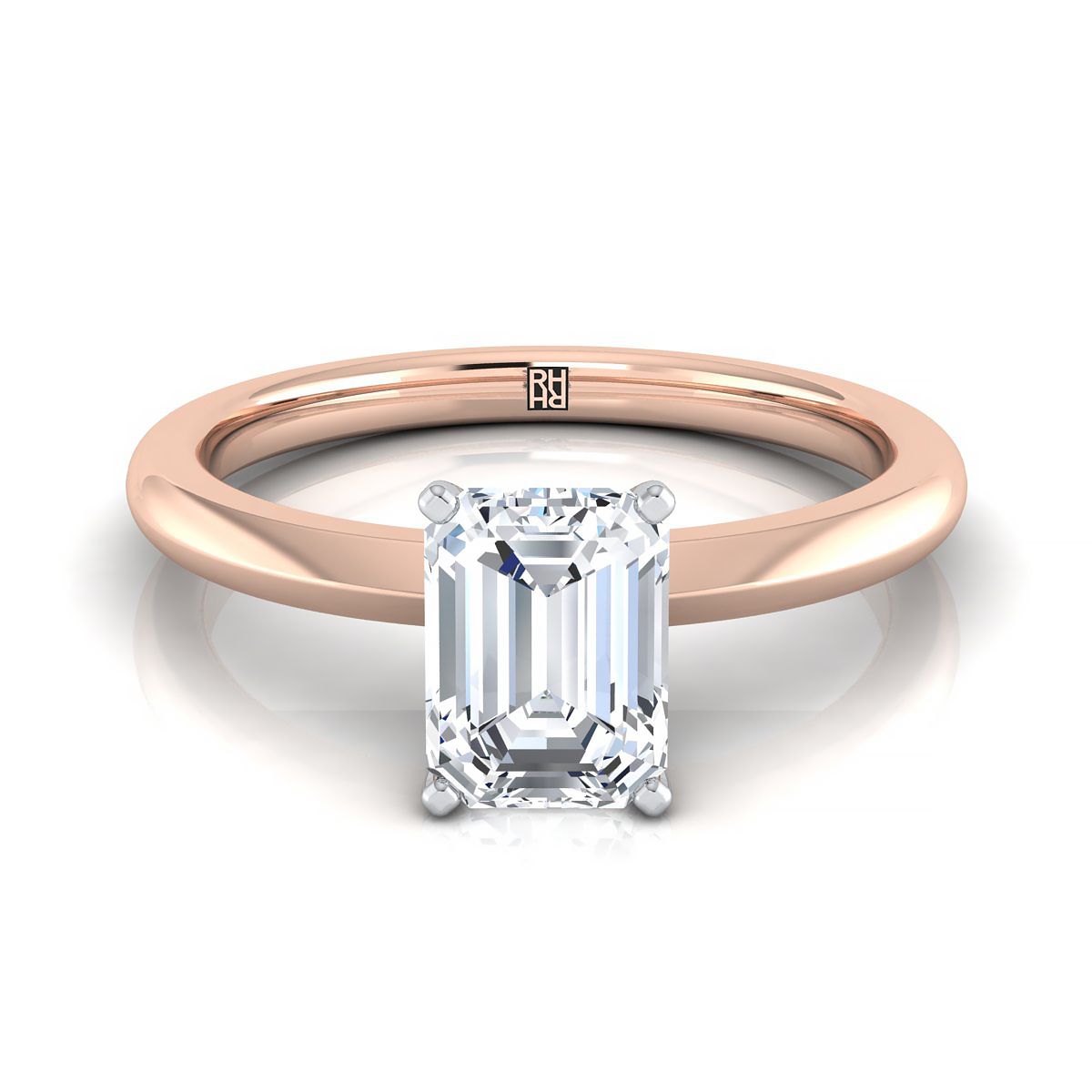 แถลงการณ์คลาสสิกของสไตล์ แหวนหมั้นเดี่ยวแบบตัดเอมเมอรัลด์นี้มีการออกแบบที่ทันสมัยด้วยขอบมีดและการตั้งศูนย์แบบ 4 ขาในทองคำกุหลาบ 14k