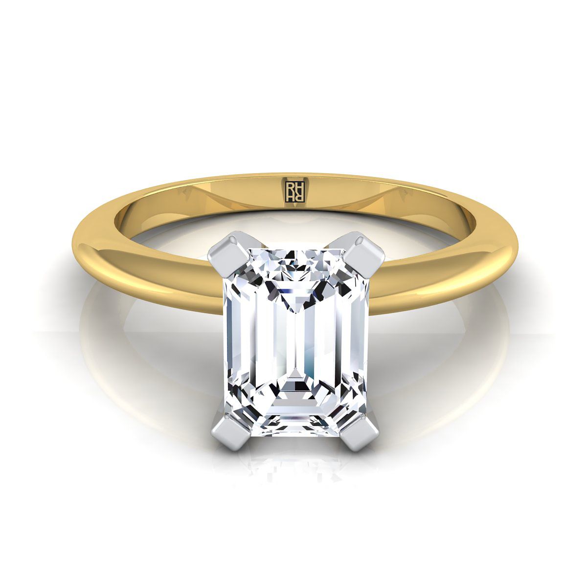 แหวนหมั้นแบบโซลิแทร์ทรงเอเมอรัลด์คัตสุดคลาสสิกนี้แสดงให้เห็นถึงสไตล์ที่โดดเด่น พร้อมด้วยขอบมีดสมัยใหม่และการตั้งศูนย์แบบ 4 กรงในทองคำเหลือง 14 กะรัต