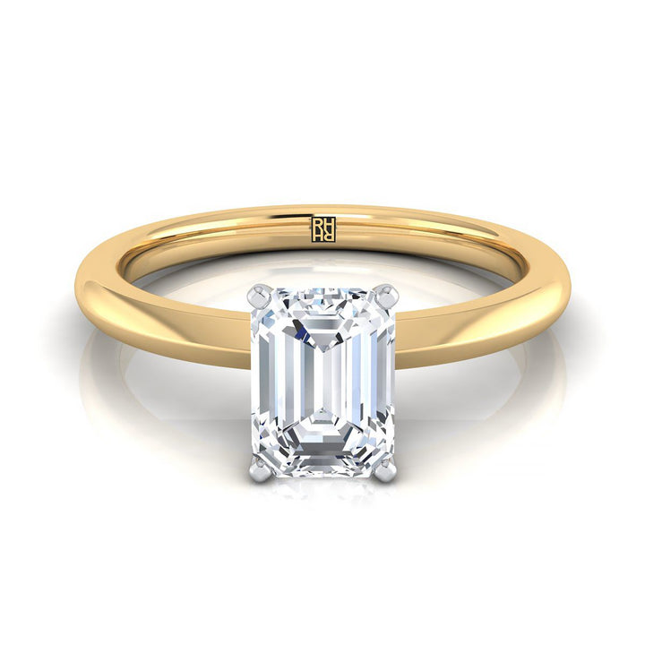 แหวนหมั้นแบบโซลิแทร์ทรงสี่เหลี่ยมมรกตสุดคลาสสิกนี้แสดงให้เห็นถึงดีไซน์ทันสมัยด้วยขอบมีดและการตั้งเม็ดกลางแบบ 4 ก้านในทองคำเหลือง 18 กะรัต