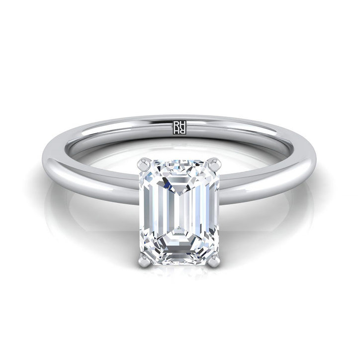 แหวนหมั้นแบบโซลิแทร์เจียระไนทรงมรกตสุดคลาสสิกนี้ โชว์ความโค้งมนของแหวนและการตั้งเม็ดกลางแบบ 4 กรงในทองคำขาว 18 กะรัต