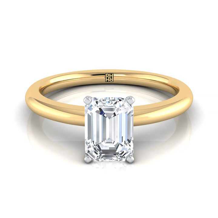 แหวนหมั้นแบบโซลิแทร์ทรงสี่เหลี่ยมมรกตสุดคลาสสิกนี้ โชว์ความโค้งมนของแหวนและการตั้งเม็ดกลางแบบ 4 ก้านในทองคำเหลือง 14 กะรัต