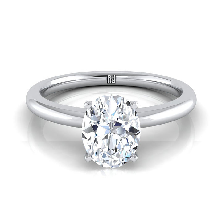 แหวนหมั้นโซลิแทร์รูปวงรีสุดคลาสสิกนี้แสดงถึงสไตล์ด้วยแหวนวงโค้งมนและการตั้งเม็ดกลางแบบ 4 ก้านในทองคำขาว 14 กะรัต