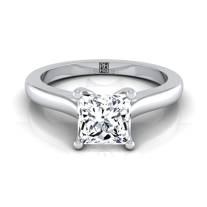 แหวนหมั้นแบบเจ้าหญิงคัตโซลิแทร์นี้เป็นการแสดงออกถึงสไตล์คลาสสิก โดยมีแหวนวงโค้งมนและการตั้งศูนย์แบบ 4 กรงในแพลตตินัม