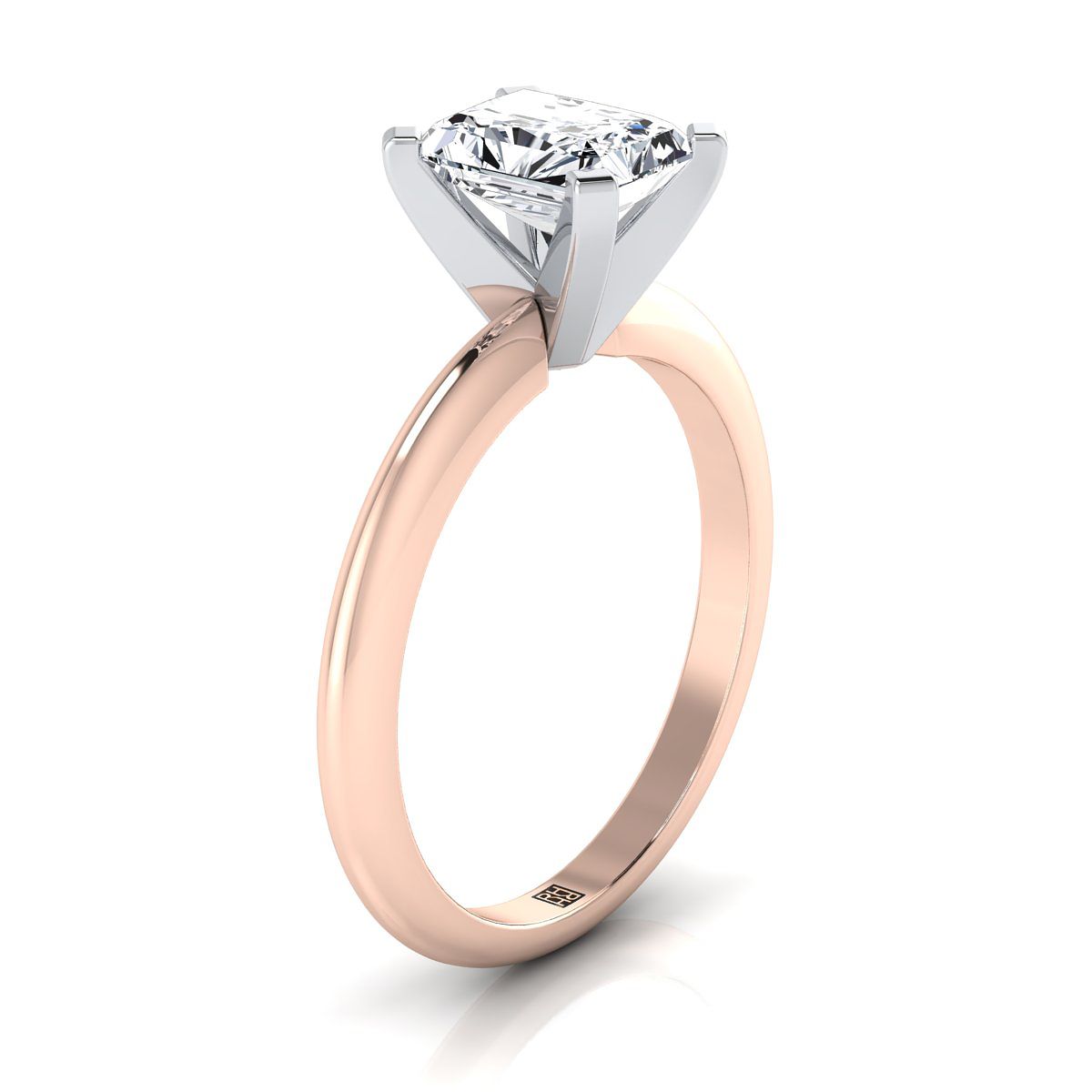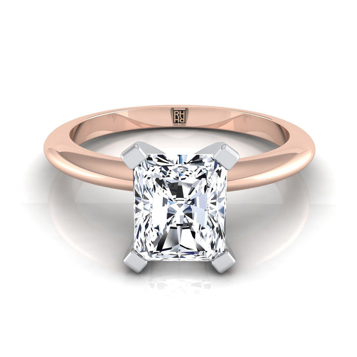 แหวนหมั้นแบบโซลิแทร์เจียระไนแบบเรเดียนต์ที่แสดงถึงสไตล์คลาสสิกนี้ มีขอบแหลมสมัยใหม่และการตั้งศูนย์แบบ 4 ก้านในทองกุหลาบ 14 กะรัต