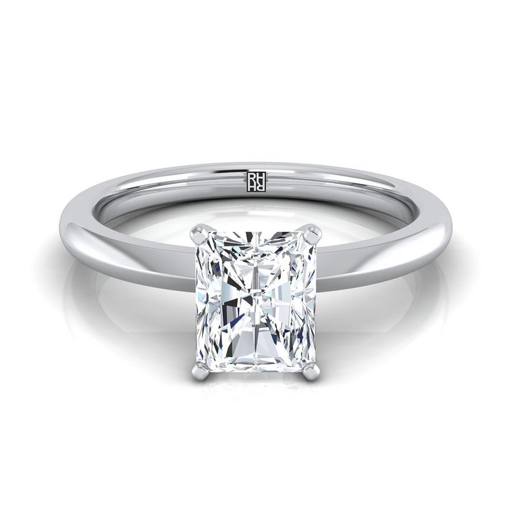 แหวนหมั้นแบบโซลิแทร์เจียระไนแบบเรเดียนต์สุดคลาสสิกนี้แสดงให้เห็นถึงขอบมีดสมัยใหม่และการตั้งศูนย์แบบ 4 ก้านในทองคำขาว 14 กะรัต