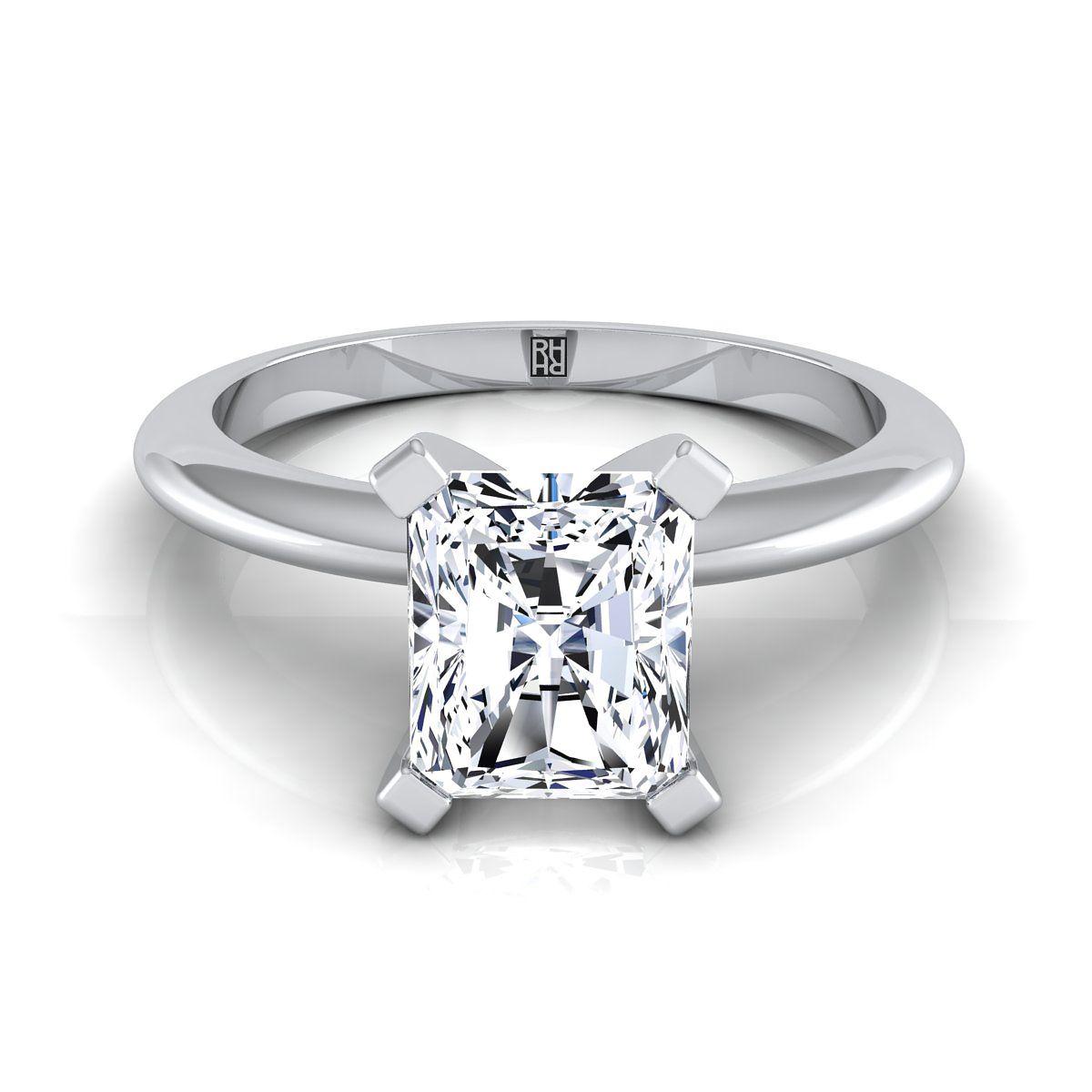 แหวนหมั้นแบบโซลิแทร์เจียระไนแบบเรเดียนต์สุดคลาสสิกนี้แสดงให้เห็นถึงขอบมีดสมัยใหม่และการตั้งศูนย์แบบ 4 ก้านในทองคำขาว 14 กะรัต