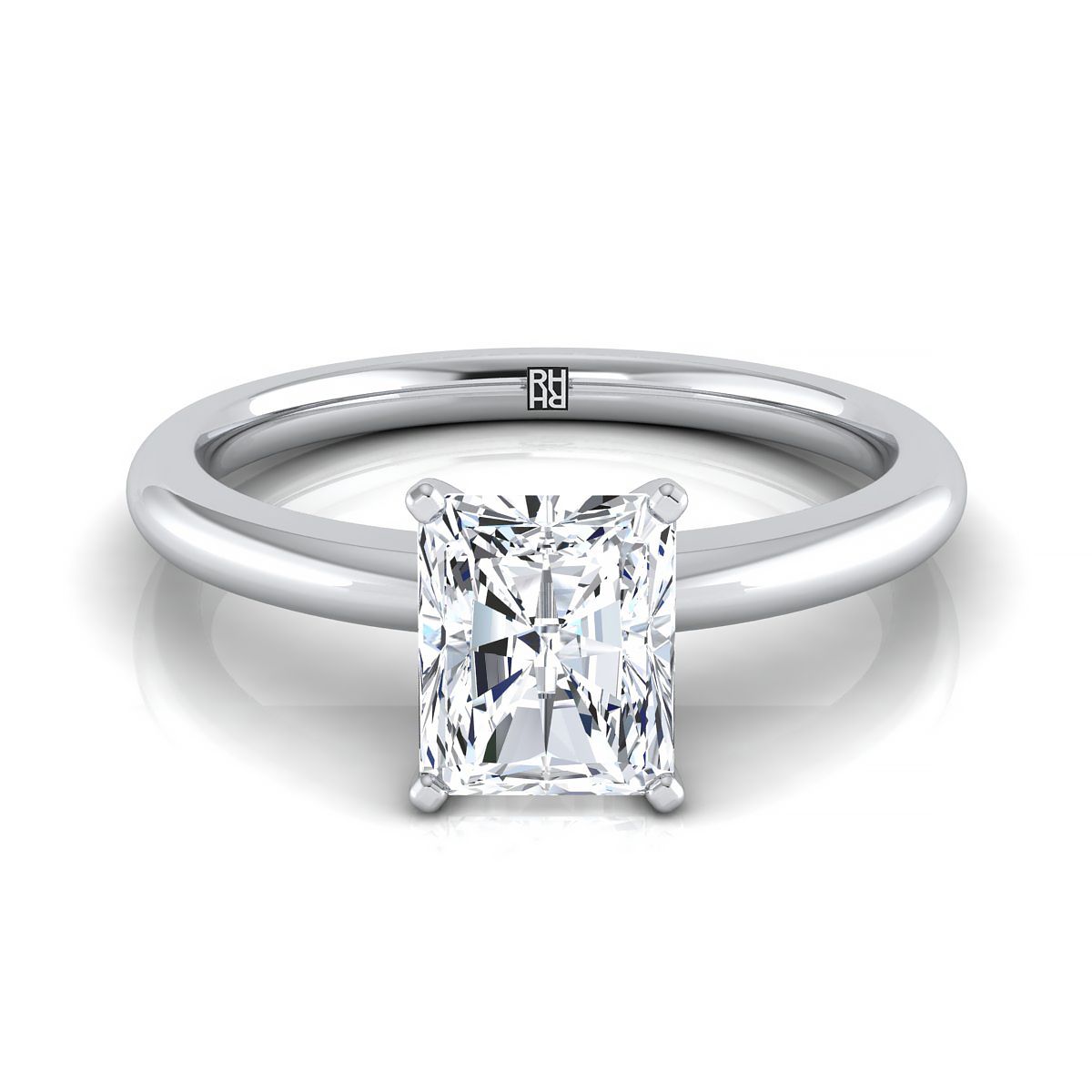แหวนหมั้นแบบโซลิแทร์เจียระไนแบบเรเดียนต์ที่แสดงถึงสไตล์คลาสสิกนี้ มีวงแหวนโค้งมนและการตั้งศูนย์แบบ 4 ก้านในแพลตตินัม