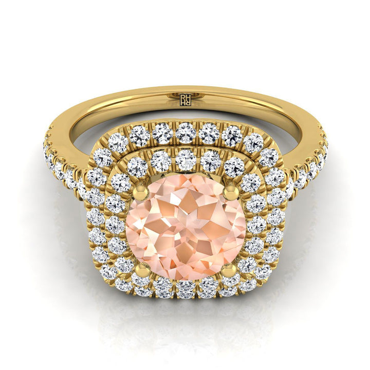 แหวนหมั้นมอร์แกไนต์ทรงกลมเจียระไนแบบ Brilliant สีทองเหลือง 18K พร้อมฮาโลคู่และเพชรปาเว่ขอบหยัก - 1/2ctw