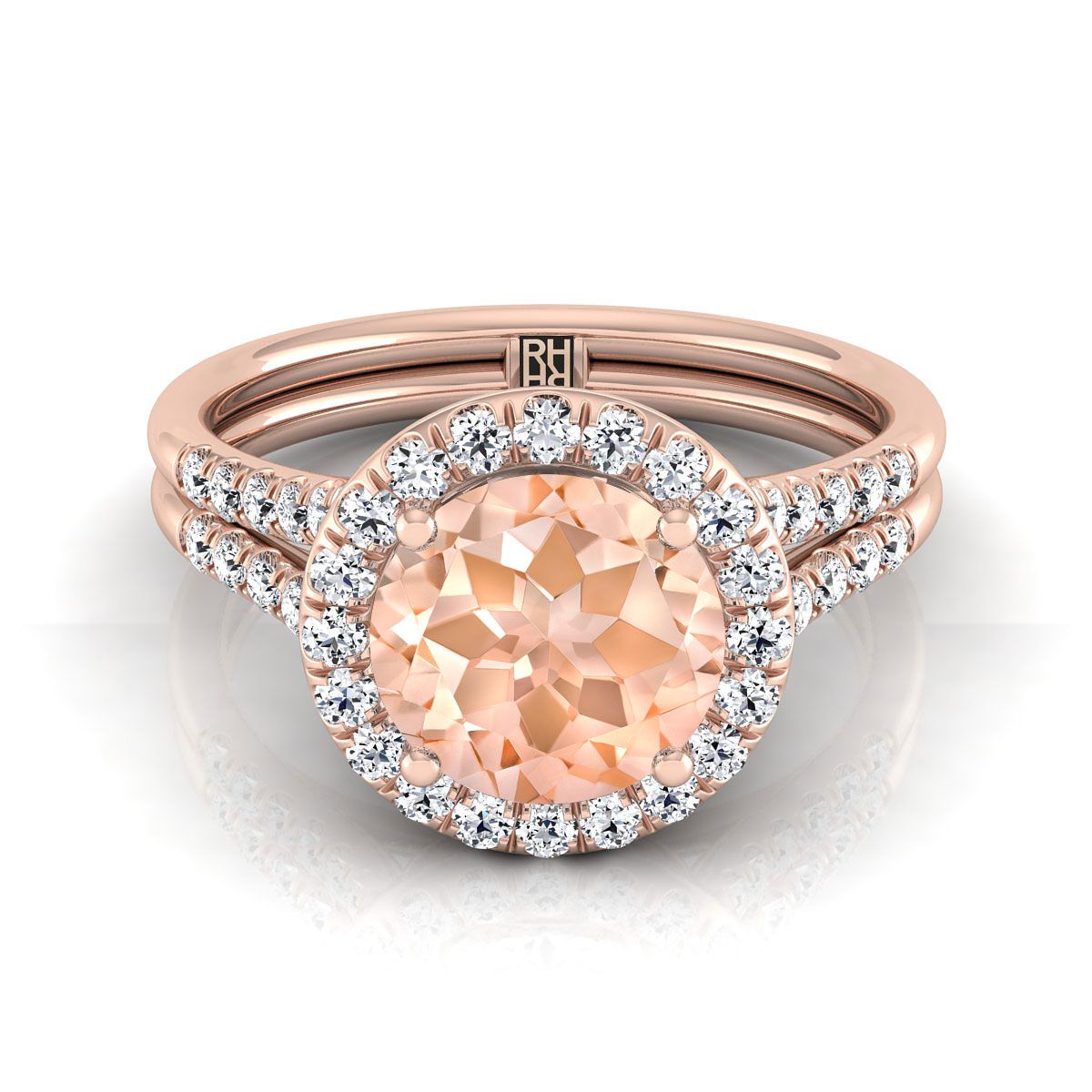 แหวนหมั้นทองคำชมพู 14K ทรงกลมเจียระไนแบบบริลเลียนต์ ฝรั่งเศสประดับเพชรแบบปาเว่ แยกช้างแหวนแบบฮาโล - 3/8ctw