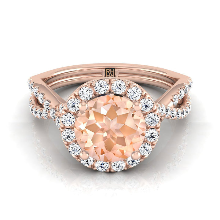 แหวนหมั้นทองคำชมพู 14K ประดับมอร์แกไนต์ทรงกลมเจียระไนแบบ Brilliant พร้อมเพชร Pavé แบบขอบหยักบิด Halo น้ำหนักรวม 1/2 กะรัต