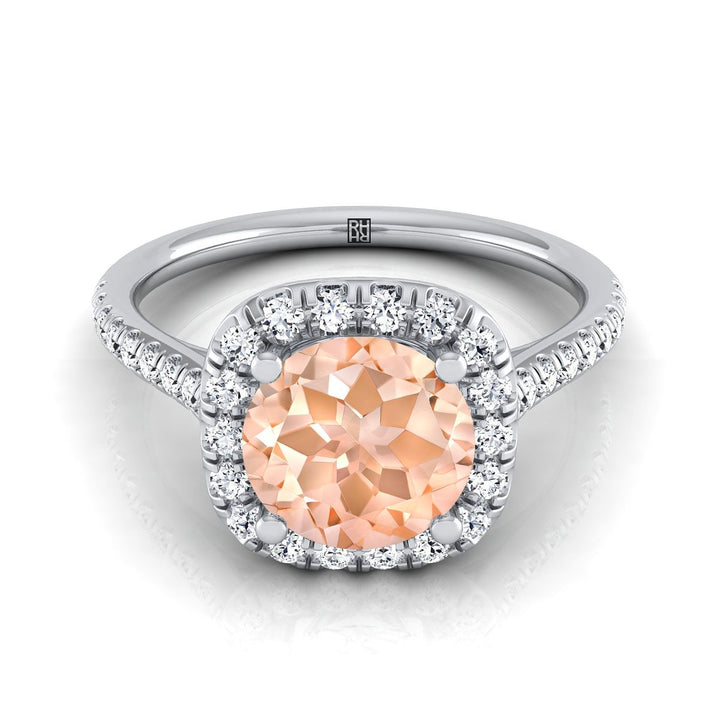 แหวนหมั้นมอร์แกไนต์ทรงกลมเจียระไนแบบบริลเลียนต์ ประดับด้วยทองคำขาว 18K แบบหนีบเรียบและฮาโลขนาด 1/3 กะรัต
