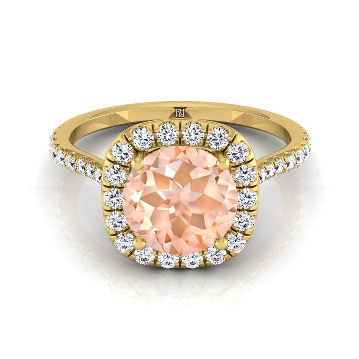แหวนหมั้นมอร์แกไนต์ทรงกลมเจียระไนแบบ Brilliant สีทองเหลือง 18K พร้อมเพชรล้อมแบบ Shared Prong น้ำหนักรวม 3/8 กะรัต